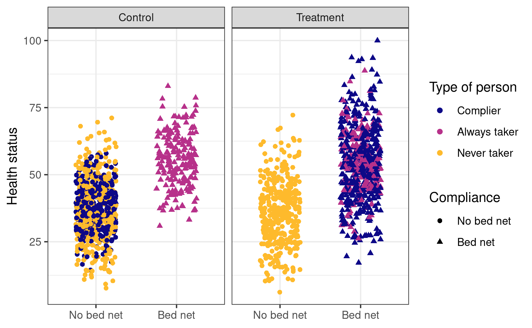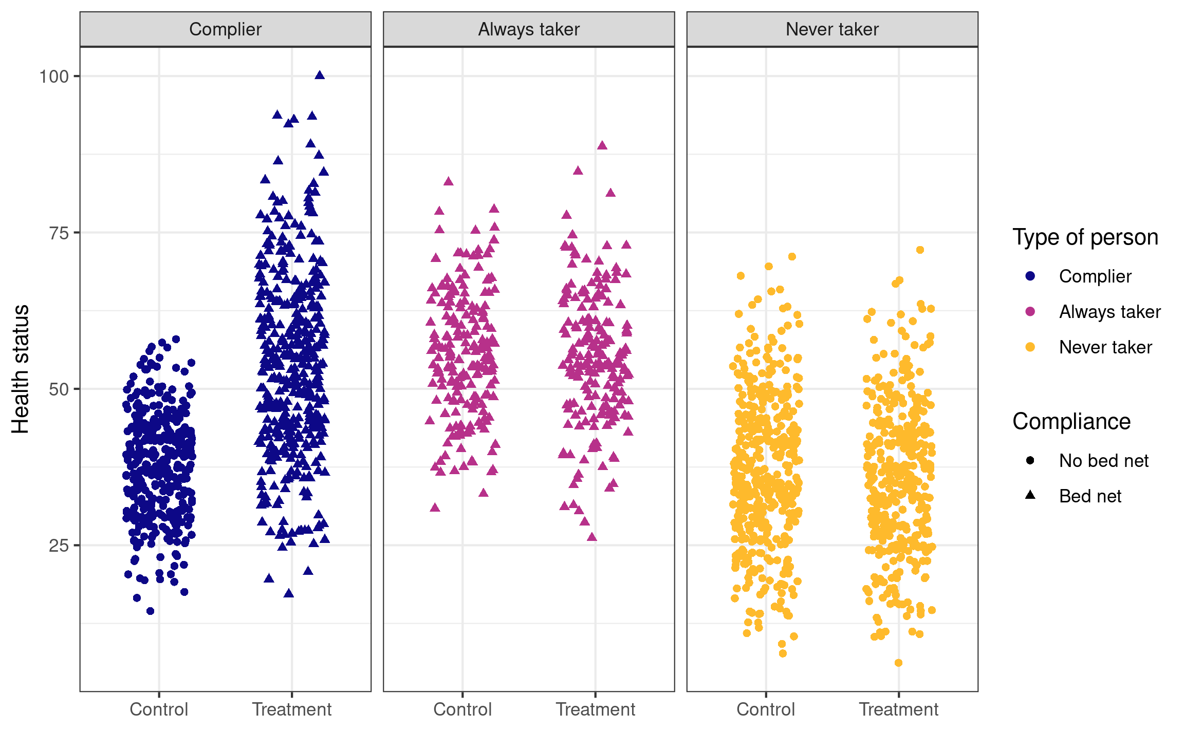 library(tidyverse) # ggplot(), %>%, mutate(), and friendslibrary(broom) # Convert models to data frameslibrary(estimatr) # Run 2SLS models in one step with iv_robust()bed_nets <-read_csv("data/bed_nets_observed.csv") %>%# Make "No bed net" (control) come firstmutate(bed_net =fct_relevel(bed_net, "No bed net"))bed_nets_time_machine <-read_csv("data/bed_nets_time_machine.csv") %>%# Make "No bed net" come first and "Complier" come firstmutate(bed_net =fct_relevel(bed_net, "No bed net"),status =fct_relevel(status, "Complier"))